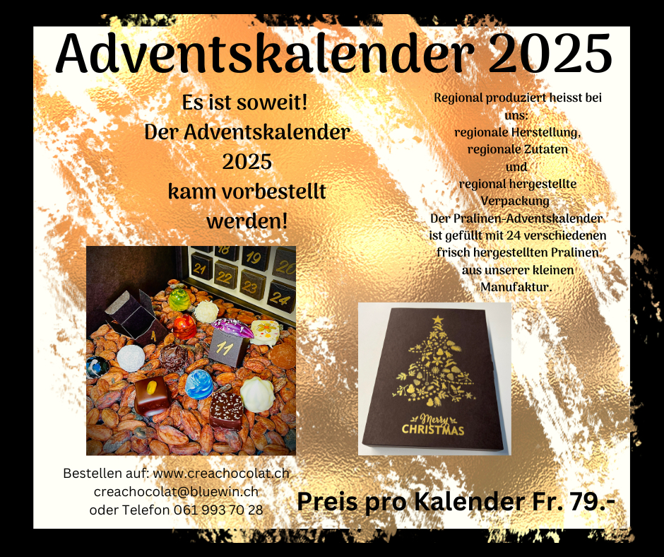 Es ist soweit! Der Adventskalender 2025 kann ab sofort vorbestellt werden! Wie jedes Jahr wird der Adventskalender mit 24 verschiedenen frisch in Handarbeit von uns hergestellten Pralinen gefüllt sein. Bestellen Sie frühzeitig um sich die gewünschte Anzahl Kalender zu sichern.