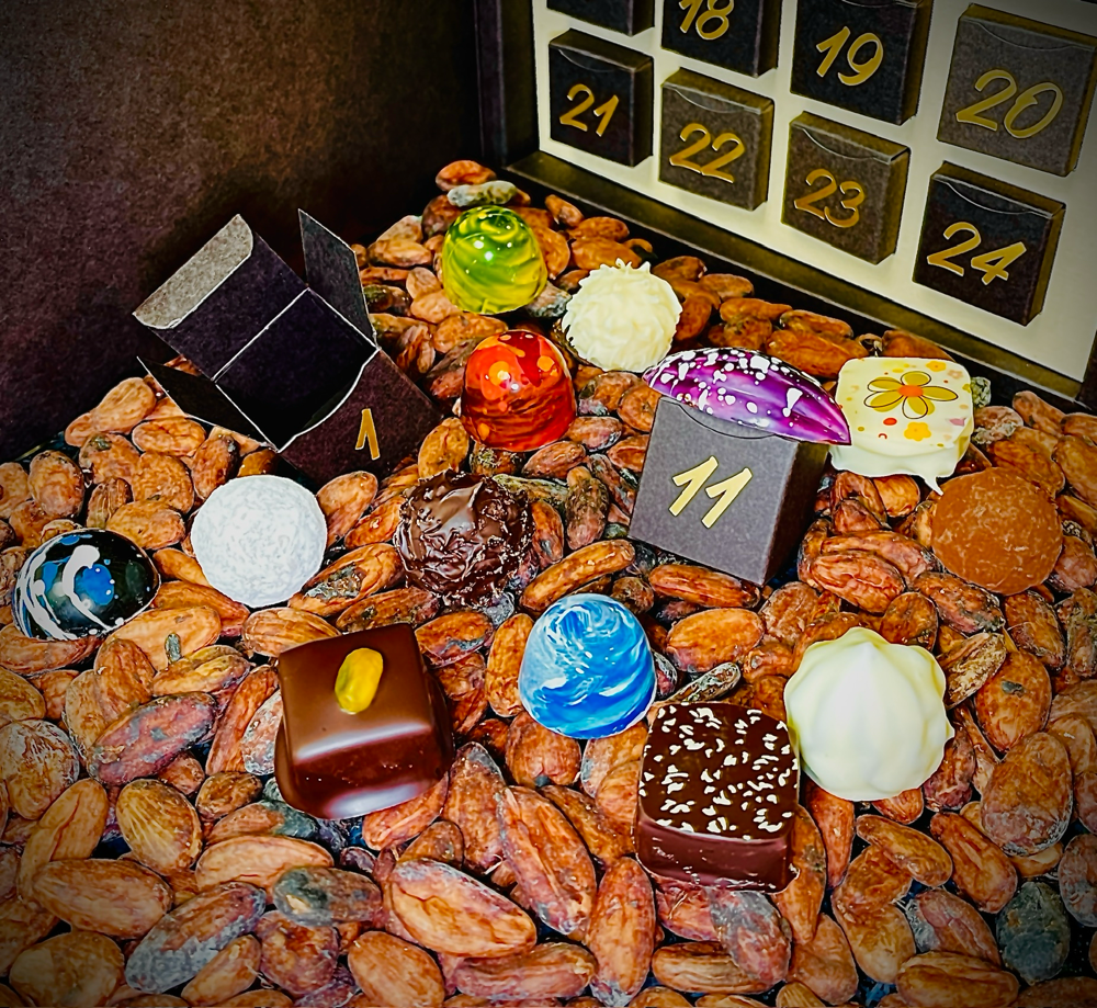 Unser Adventskalender wird Ende November mit frisch hergestellten Pralinen für sie gefüllt. Wie gewohnt mit hochwertigen und kreativen Kunstwerken aus unserer Manufaktur im Fricktal.